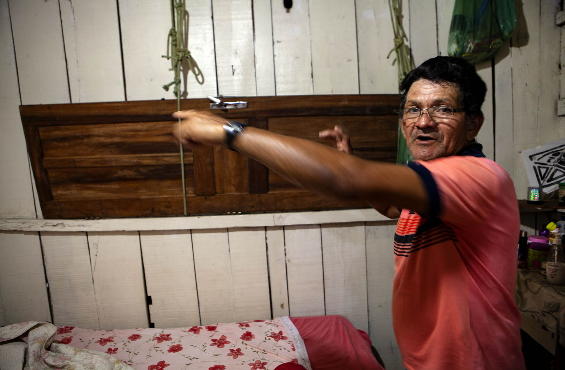 "Carlos Alves Moraes, ribeirinho que virou pintor de paredes, mostra a porta suspensa por cordas que usa para erguer seus pertences mais importantes quando a casa alaga (Foto cedida por Lilo Clareto à Amazônia Real)"